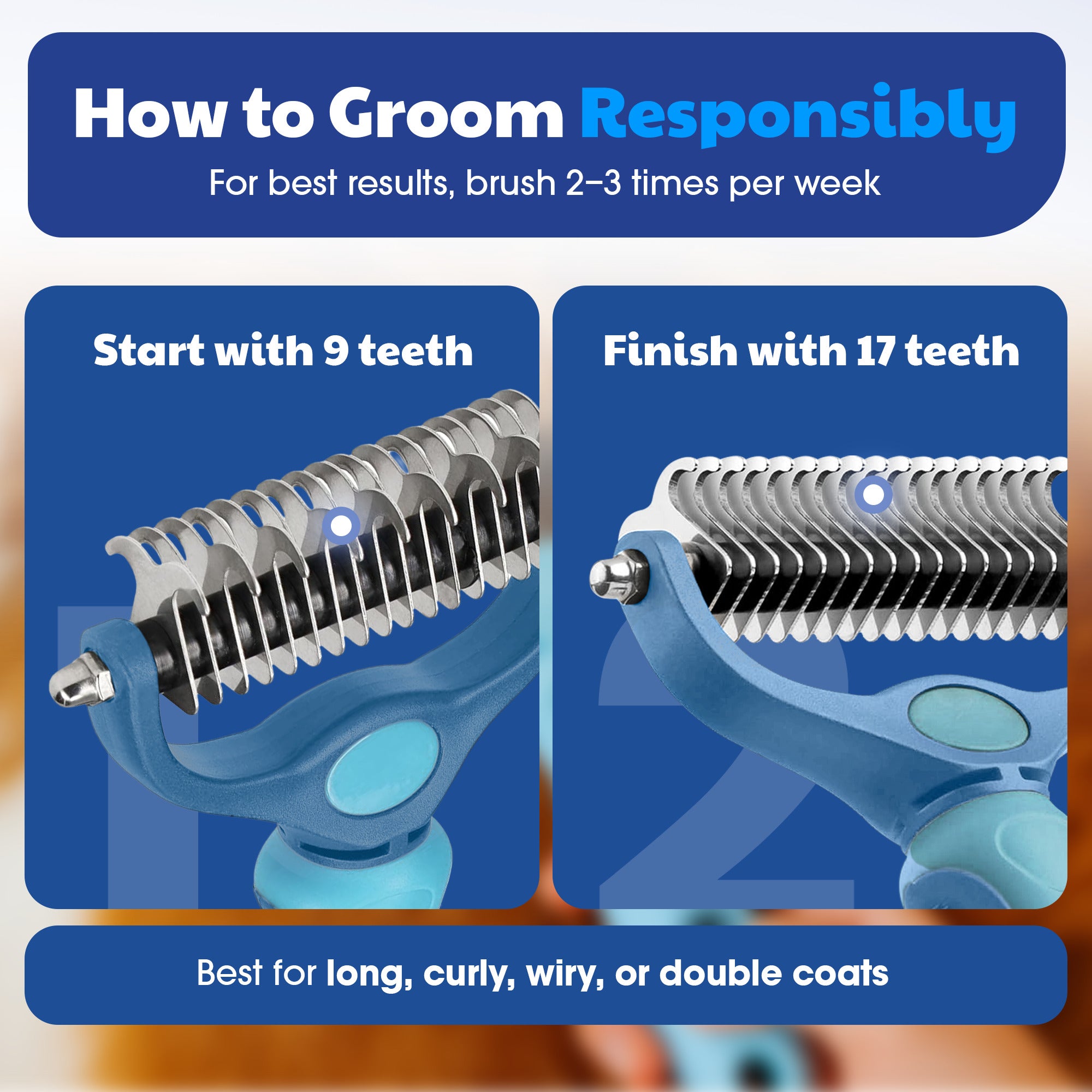 - Dual-Sided for Versatile Grooming: Use the rake’s 9-teeth side to gently remove mats and tangles, then switch to the 17-teeth side to remove loose undercoat hair. Follow up with the extra-thick wipes to pick up remaining dander and dirt.